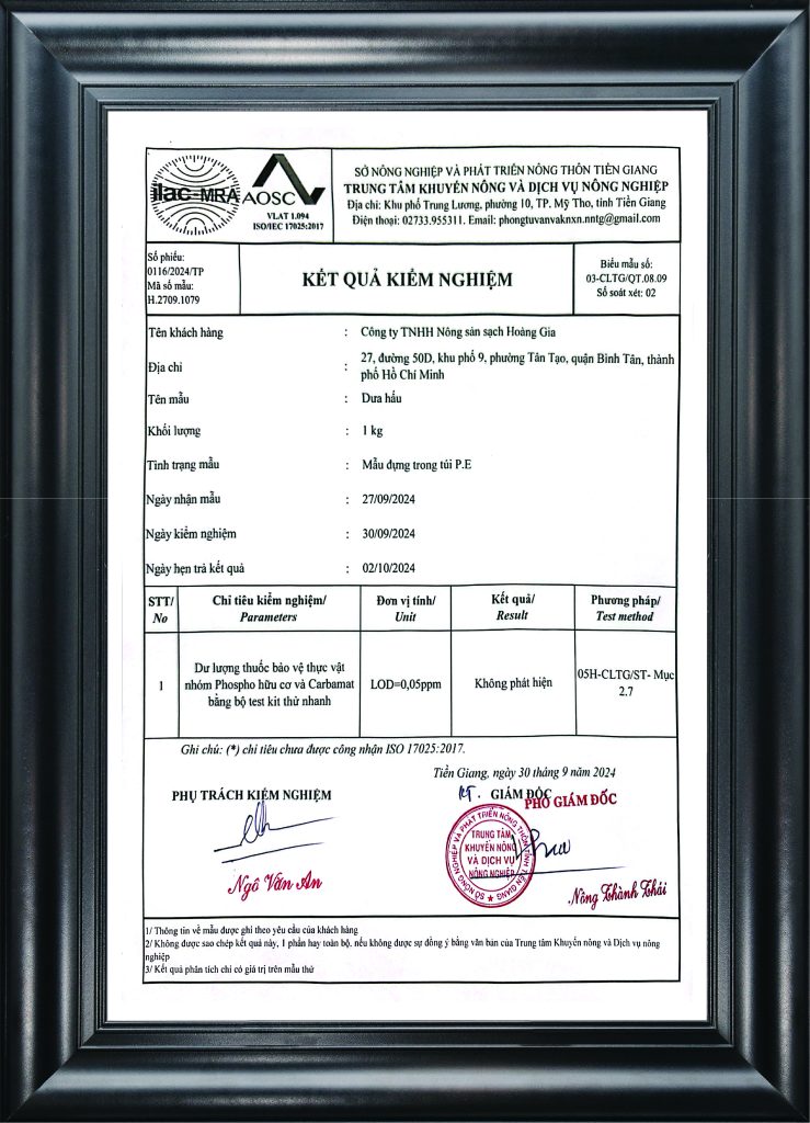 Sản phẩm DƯA HẤU ĐỎ của HG Fresh được kiểm nghiệm tại Trung Tâm Khuyến Nông và Dịch Vụ Nông Nghiệp Đồng Tháp (Tiền Giang cũ), cho kết quả không phát hiện dư lượng thuốc bảo vệ thực vật (gốc Phospho hữu cơ và gốc Carbamates) mang đến cho khách hàng sự an tâm tuyệt đối về chất lượng và độ an toàn.
