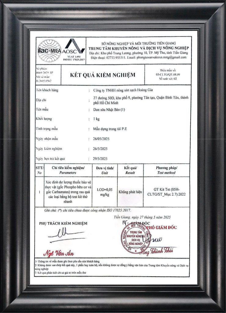 Sản phẩm Dưa Sữa Nhật của HG Fresh được kiểm nghiệm tại Trung Tâm Khuyến Nông và Dịch Vụ Nông Nghiệp Đồng Tháp (Tiền Giang cũ), cho kết quả không phát hiện dư lượng thuốc bảo vệ thực vật (gốc Phospho hữu cơ và gốc Carbamates) mang đến cho khách hàng sự an tâm tuyệt đối về chất lượng và độ an toàn.