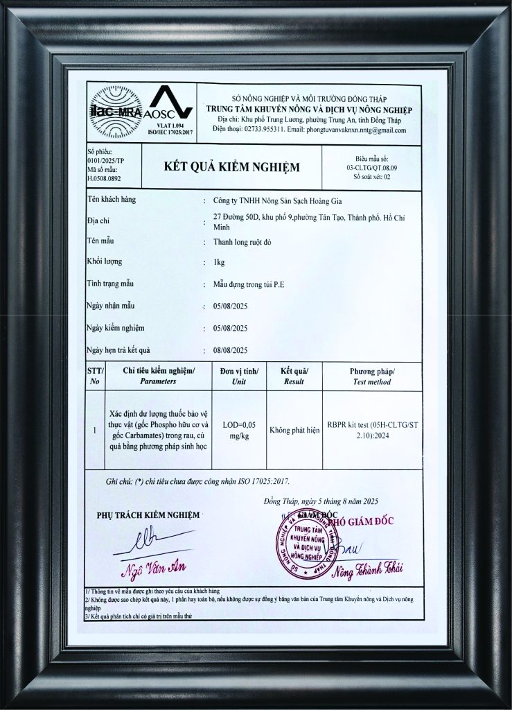 Sản phẩm THANH LONG RUỘT ĐỎ của HG Fresh được kiểm nghiệm tại Trung Tâm Khuyến Nông và Dịch Vụ Nông Nghiệp Đồng Tháp (Tiền Giang cũ), cho kết quả không phát hiện dư lượng thuốc bảo vệ thực vật (gốc Phospho hữu cơ và gốc Carbamates) mang đến cho khách hàng sự an tâm tuyệt đối về chất lượng và độ an toàn.