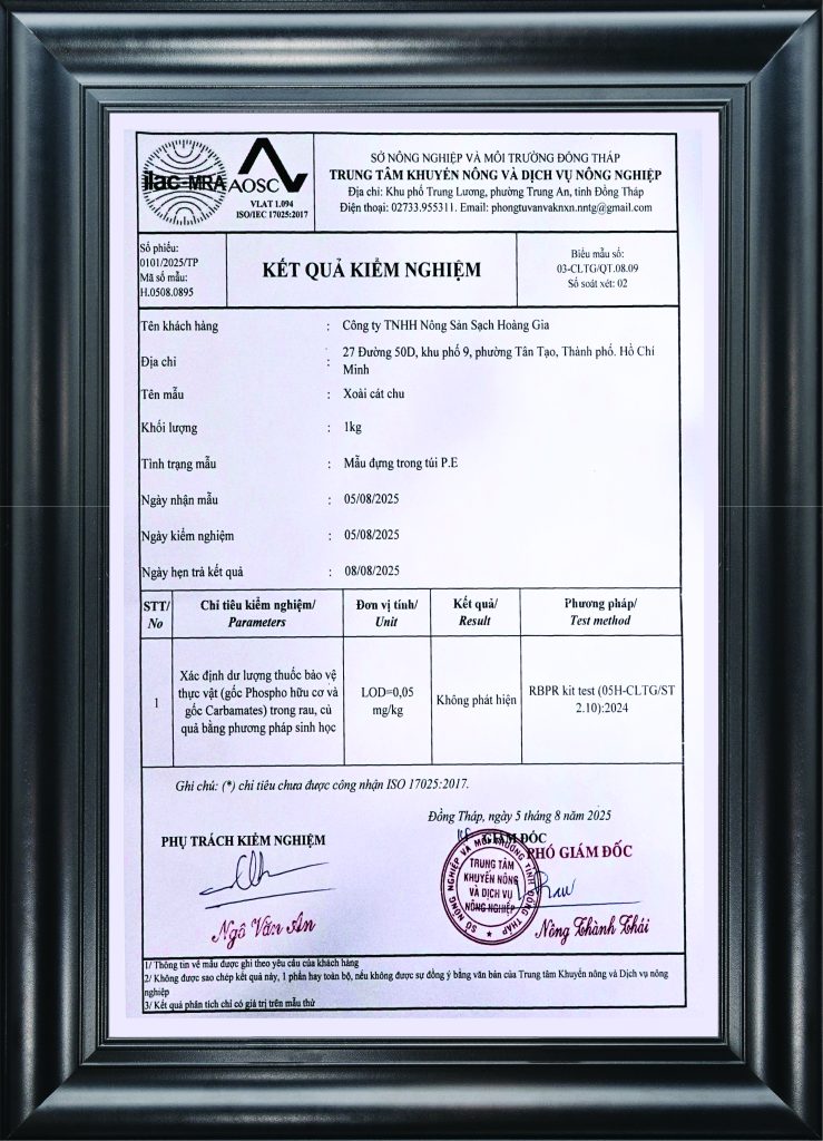 Sản phẩm Xoài Cát Chu của HG Fresh được kiểm nghiệm tại Trung Tâm Khuyến Nông và Dịch Vụ Nông Nghiệp Đồng Tháp, cho kết quả không phát hiện dư lượng thuốc bảo vệ thực vật (gốc Phospho hữu cơ và gốc Carbamates) mang đến cho khách hàng sự an tâm tuyệt đối về chất lượng và độ an toàn.